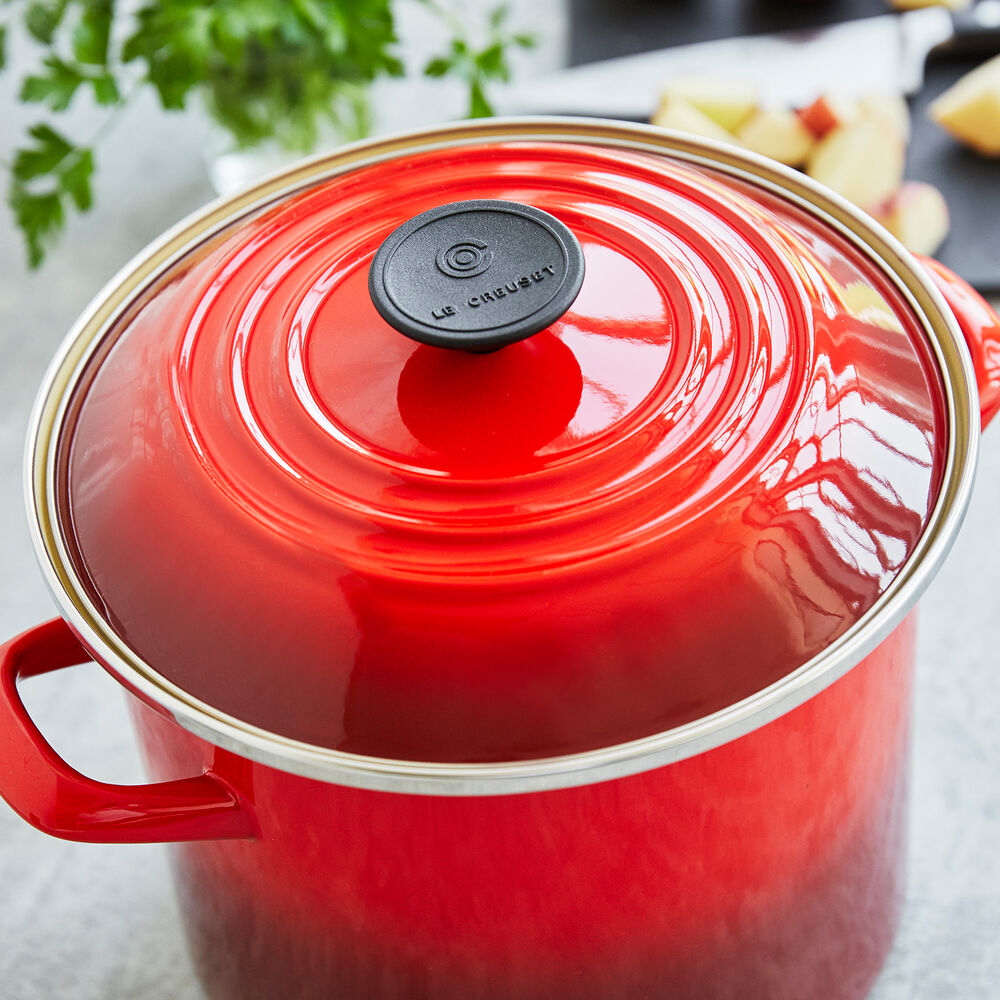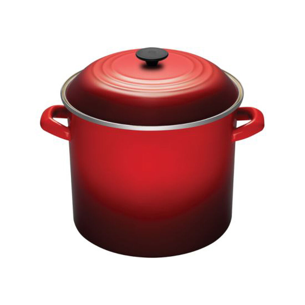 Le Creuset enamel on steel stockpots are constructed of durable carbon steel and glazed in enamel. Le Creuset Enamel On Steel Stockpot 10 qt Cerise. Le Creuset size 14 is a small cast-iron casserole with a capacity of 1 US quart or 09 liters.