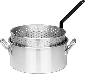 Features include heavy-duty riveted side handles which provide safe handling and secure movement. Perforated strainer basket with insulated handle and drain hook. Aluminum stock pot with strainer Basket is the ideal size for preparing your favorite foods such as fish wings or fries.